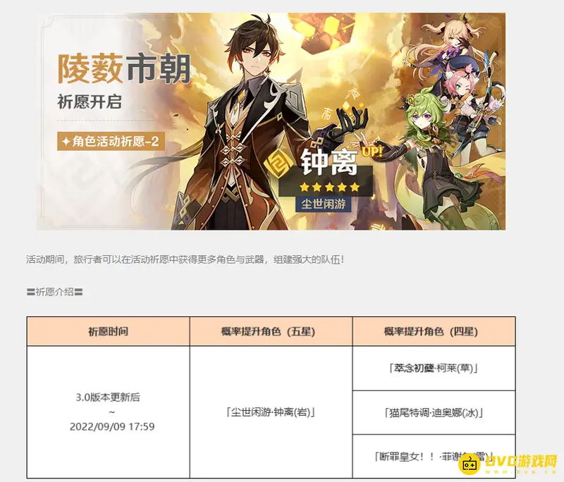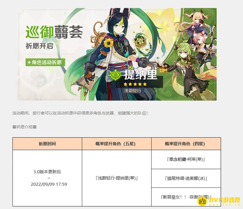 3.0UP池顺序是上半提纳里和钟离,下半是甘雨和珊瑚宫心海,上半是从3.0版本更新开始到2022年9月9日17:59,五星UP角色是提纳里和钟离,陪跑四星是柯莱、菲谢尔和迪奥娜。