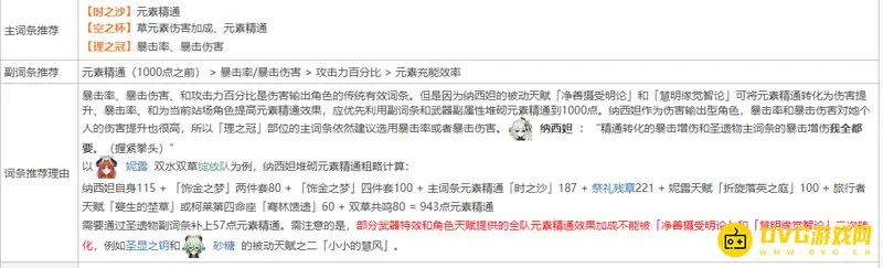 建议元素精通(1000点之前) > 暴击率/暴击伤害 > 攻击力百分比 > 元素充能效率。暴击率、暴击伤害、和攻击力百分比是伤害输出角色的传统有效词条。但是因为纳西妲的被动天赋净善摄受明论和慧明缘觉智论可将元素精通转化为伤害提升、暴击率、和为当前站场角色提高元素精通效果,应优先利用副词条和武器副属性堆砌元素精通到1000点。