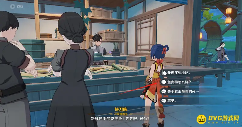 3、来到店铺门口后与NPC快刀陈对话,选择鱼卖的怎么样选项。