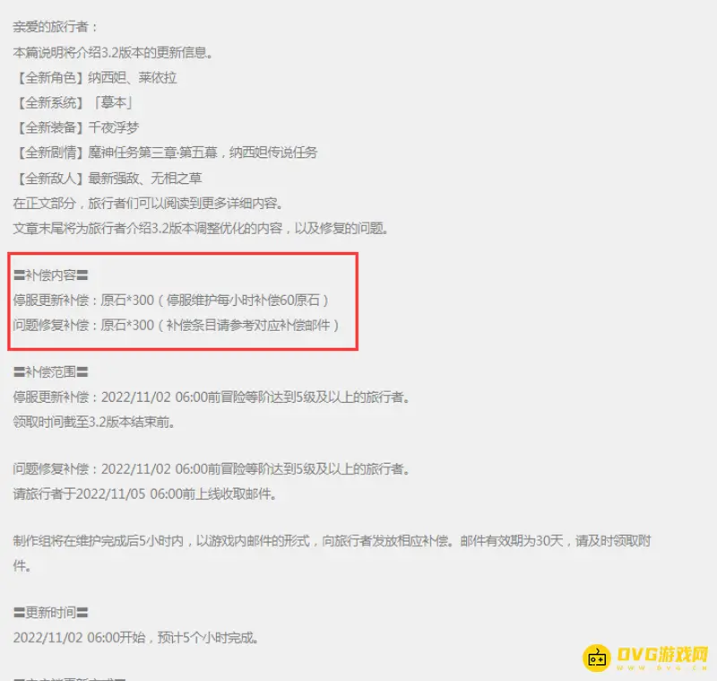 原神3.2更新补偿600原石。在原神3.2版本,更新时间是2022/11/02 06:00开始,预计5个小时完成。停服更新补偿:原石*300(停服维护每小时补偿60原石),问题修复补偿:原石*300。