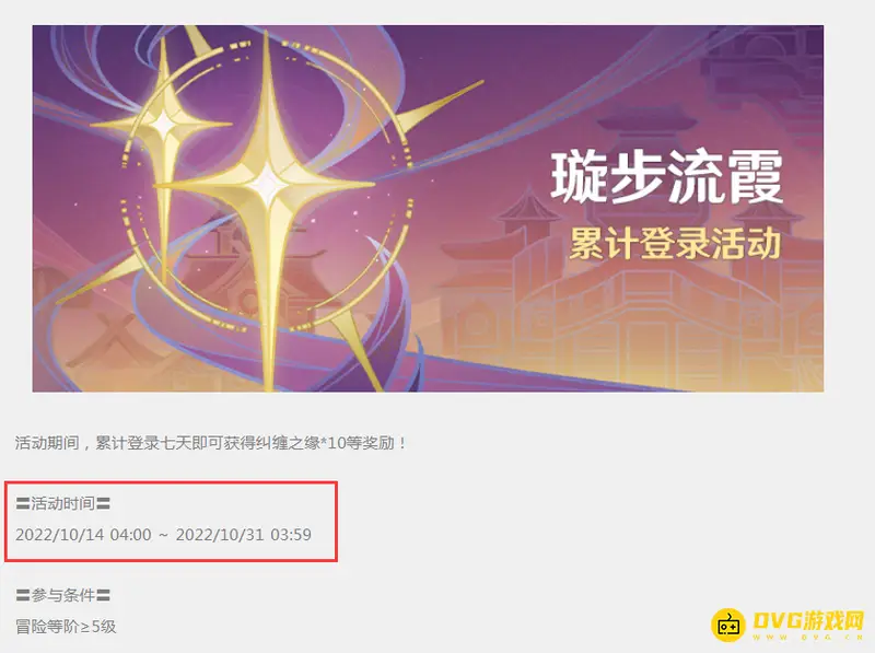 原神3.1璇步流霞活动2022/10/31 03:59结束。在原神游戏中,璇步流霞活动时间:2022/10/14 04:00 ~ 2022/10/31 03:59,活动期间,累计登录七天即可获得纠缠之缘*10等奖励!