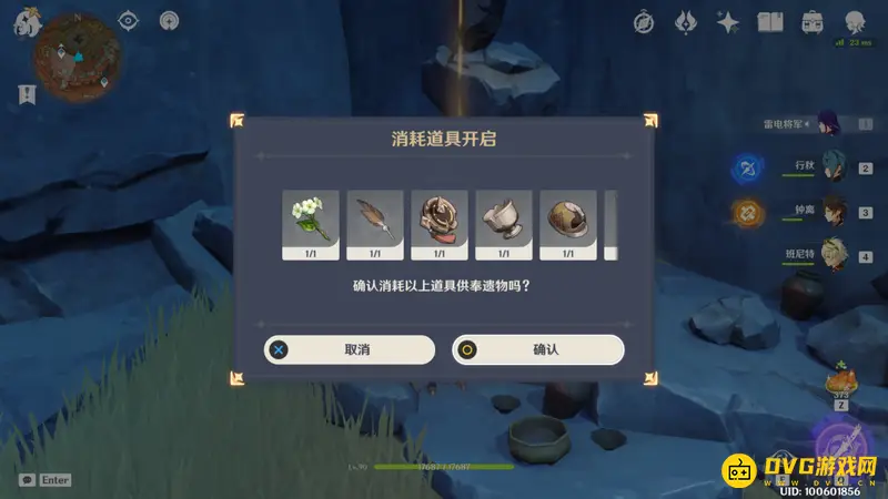 取得6个供物后返回纪念石的位置开启宝藏,其中有一个华丽的宝箱以及四星千岩牢固系列圣遗物若干
