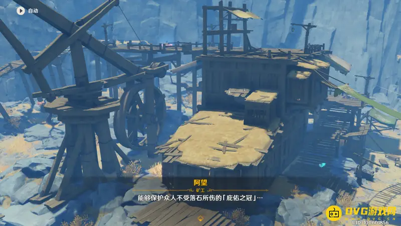 与阿望的对话中我们可以了解到六个供物的信息,以及所在位置的大致方位。如果不知道自己还有哪个供物没拿的,可以与阿望再次对话或者对照下文寻找。能够保护众人不受落石所伤的「庇佑之冠」。