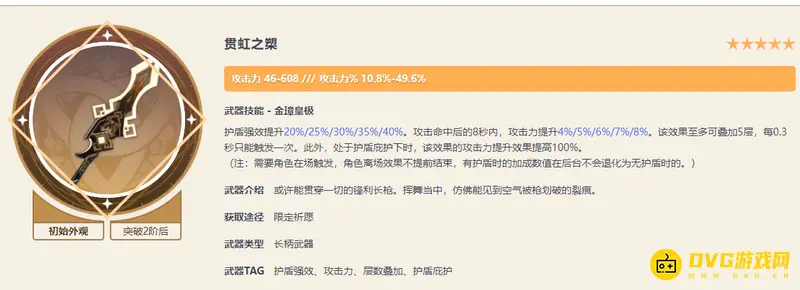 武器可以选择贯虹之槊,该武器被动能够提升钟离护盾的厚度,而且具备了提升一定输出的能力。