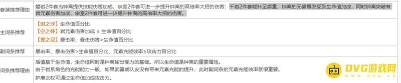 可以带加生命值的圣遗物,千岩2件套能补足盾量,钟离的元素爆发受到生命值加成,同时钟离突破有岩元素伤害加成,宗室2件套可进一步提升钟离的高倍率大招的伤害。