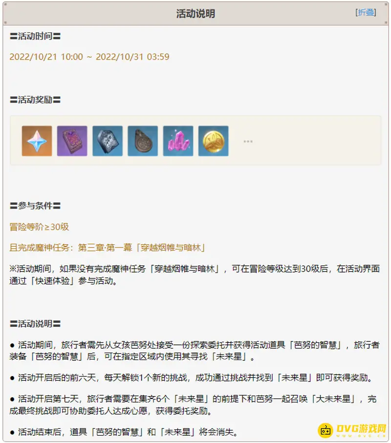 活动期间,如果没有完成魔神任务「穿越烟帷与暗林」,可在冒险等级达到30级后,在活动界面通过「快速体验」参与活动。