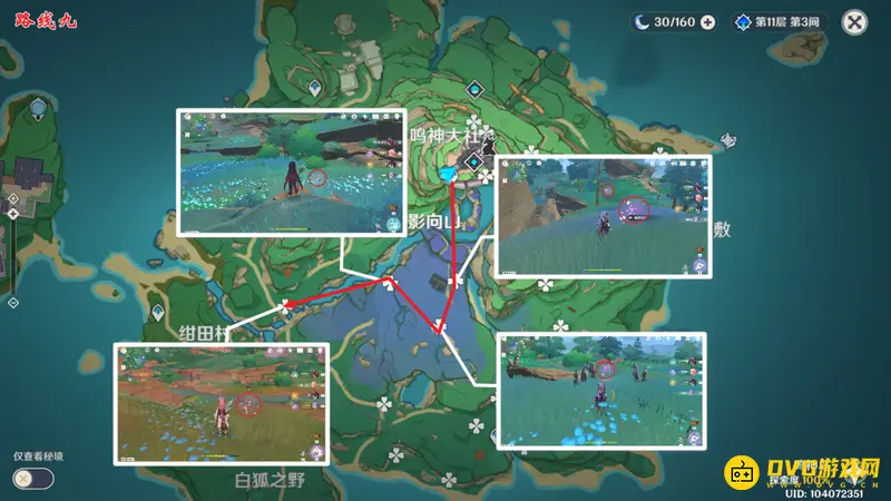 鸣神大社上面绕一圈后,注意观察最后两个点的位置。倒数第二个点的位置,是贴近山体的,在下落的过程开启元素视野,方便找寻此绯樱绣球。