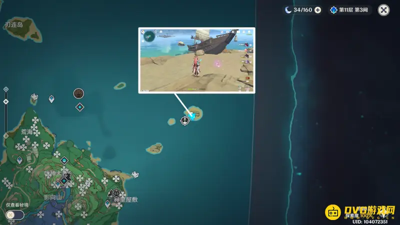 位于神里屋敷的右边的海域,需要开船过去,且就一个绯樱绣球,所以不建议去采集。