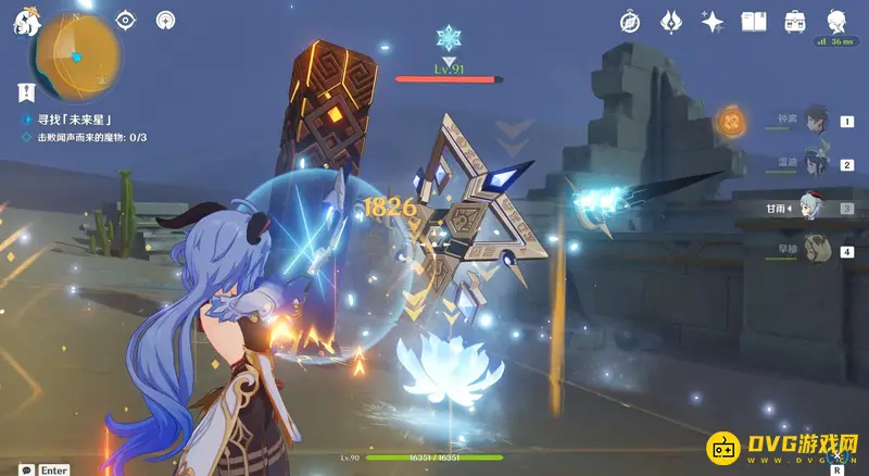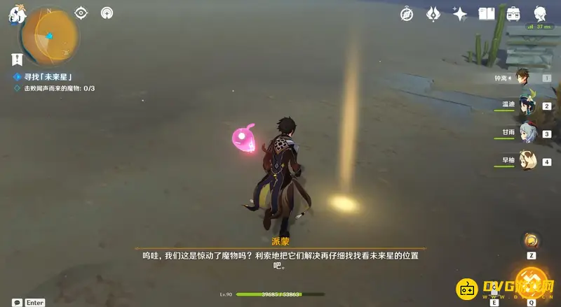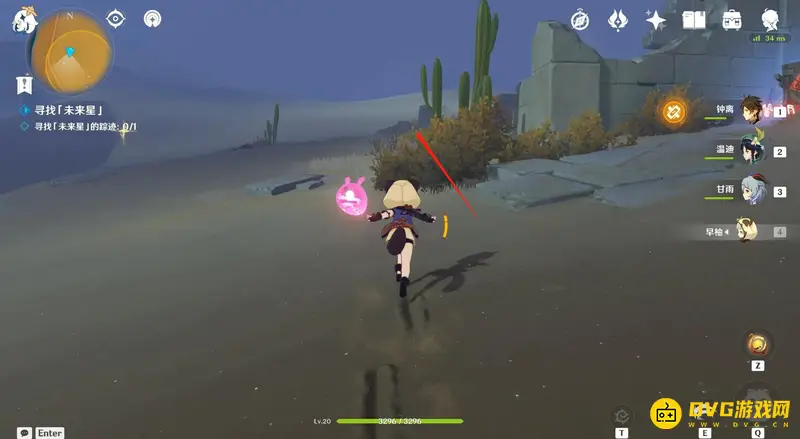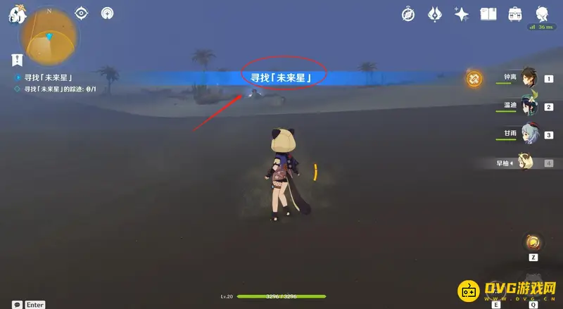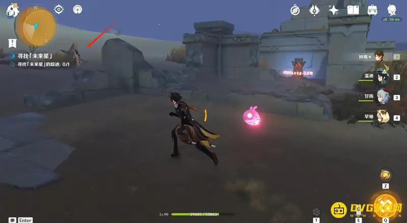 3、前进一段距离后在游戏界面会出现寻找未来星的提示,这时看向西南方向可以看到一个火元素方碑,去到火元素方碑的位置。