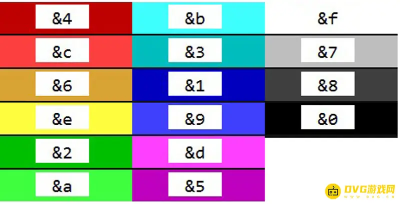2.&4=大红、&c=浅红、&6=土黄、&e=金黄、&2=绿、&a=浅绿、&b=蓝绿、&3=天蓝。&1=深蓝、&9=蓝紫、&d=粉红、&5=品红、&f=白、&7=灰、&8=深灰、&0=黑。