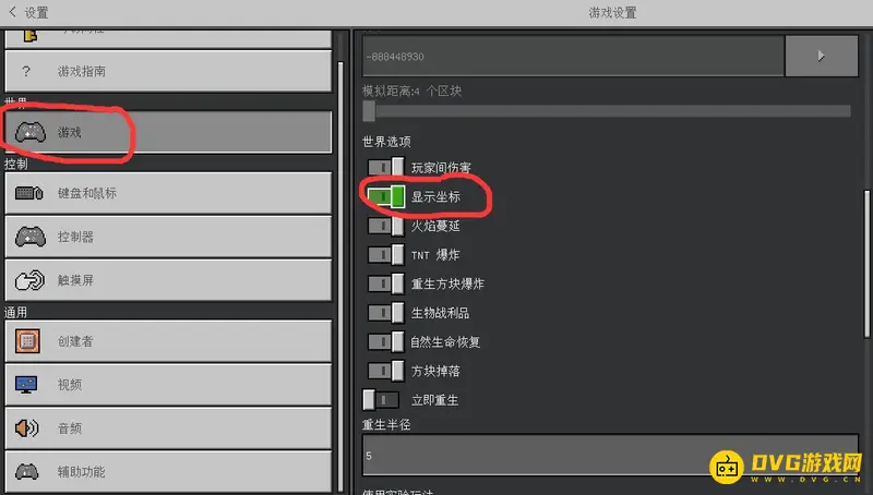 2,然后点击左侧的游戏,在右侧找到显示坐标,把显示坐标打开。