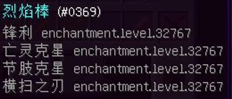 接下来,我们要了解怎么给给予的物品附魔。依然是先给指令。/give 770019293 minecraft:blaze_rod 1 0 {ench:[{id:16,lvl:32767},{id:17,lvl:32767},{id:22,lvl:32767},{id:18,lvl:32767}]}前面的就不需要解说了吧,我们从{ench开始解说ench: 附魔前缀,只要你想要附魔,就必须加上这个前缀。 表示开始说明要附的魔。{id:16,lvl:32767},{id:17,lvl:32767},{id:22,lvl:32767},{id:18,lvl:32767} 每部分,就是附魔的英文代码,逗号是隔开,想要一次性附魔很多的话可以在每部分附魔前面加上逗号。id后是附魔代码,这个可以自己去百度搜索。lvl是等级,需要多少级就弄多少,最高32767级。]} 就是接住前面的括号,注意顺序,少一个括号都是会数据标签分析失败的。