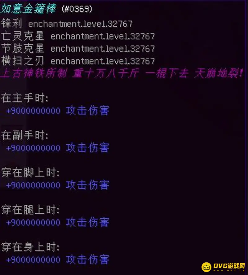 接下来就是比较复杂的了,这个只放指令,因为我也弄得不太懂,这个大家可以去我的世界中文论坛查找一下。/give 770019293 minecraft:blaze_rod 1 0 {AttributeModifiers:[{Operation:0,UUIDLeast:1,UUIDMost:1,Amount:9000000000.0,AttributeName:generic.attackDamage,Name:Attack}]}。最后把全部的都联合在一起 /give 770019293 minecraft:blaze_rod 1 0 {ench:[{id:16,lvl:32767},{id:17,lvl:32767},{id:22,lvl:32767},{id:18,lvl:32767}],Unbreakable:1b,display:{Name:"如意金箍棒",Lore:["上古神铁所制 重十万八千斤 一棍下去 天崩地裂!"]},AttributeModifiers:[{Operation:0,UUIDLeast:1,UUIDMost:1,Amount:9000000000.0,AttributeName:generic.attackDamage,Name:Attack}]} 中间要用逗号隔开,别忘记加括号,就可以了。