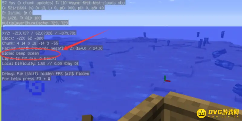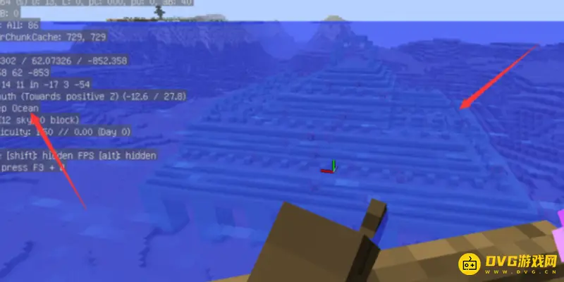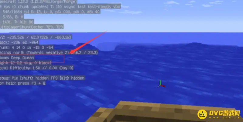 3、找到大海之后,要知道,一般海底神殿都是在深海区,按键盘上的F3弹出一个很多数字的界面,找到Biome:Deep Ocean就表示是深海区了。