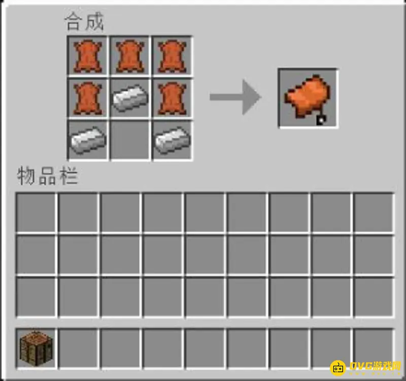 一、马鞍合成是很容易的,有皮革铁锭即可,只要把这两种材料摆放正确即可合成马鞍,如下图所示;