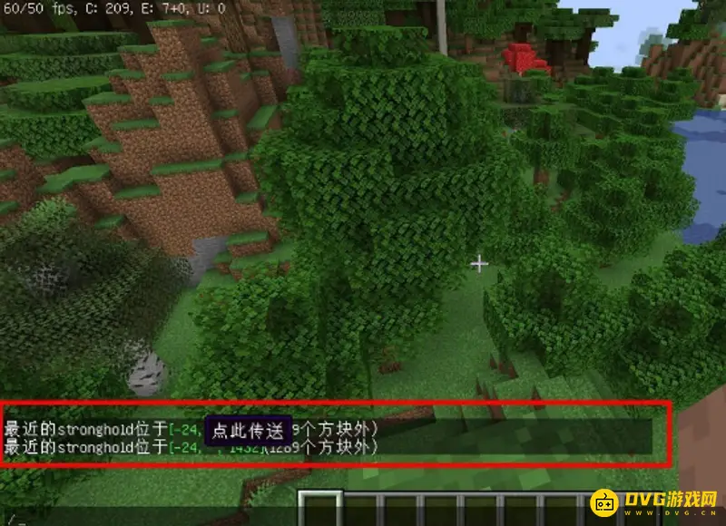 屏幕出现了地牢的坐标,点击“/”打开指令框,点击系统生成的坐标,按下回车键,就会被传送到地牢上方。