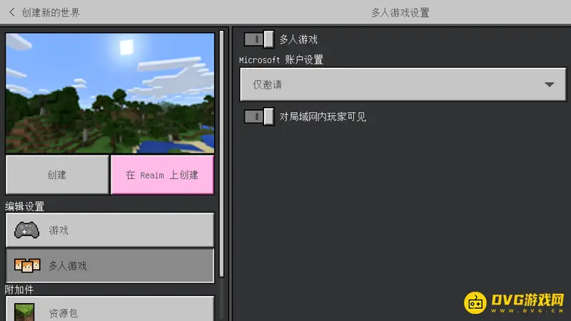 2.点击游戏——新建——创建新世界,关于创建世界的设设置,自己根据喜好进行设置,但关于多人游戏的设置,一定要打开,也要打开”对局域网的玩家内玩家可见“这个设置,minecraft账户设置建议调成仅邀请,避免其他玩家进入,示例如图所示: