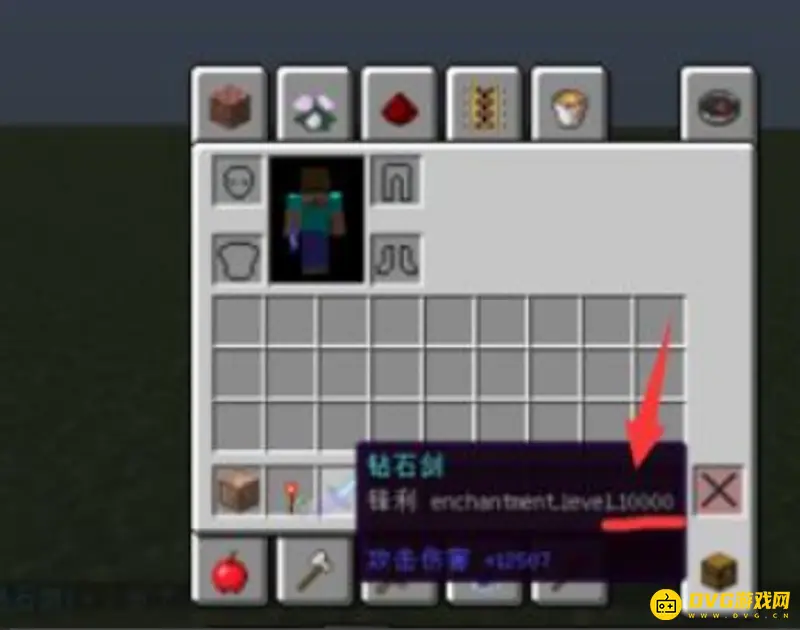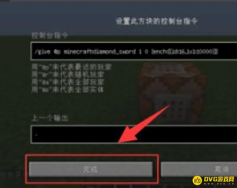 4、把命令方块放在地上,右键打开它。输入“ /give @p minecraft:diamond_sword 1 0 ench:id:16,lvl:10000 ”并且点击“完成”。按“E"打开物品栏。查看一下,看,是锋利10000的钻石剑!