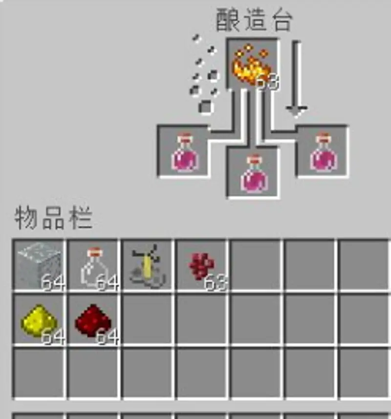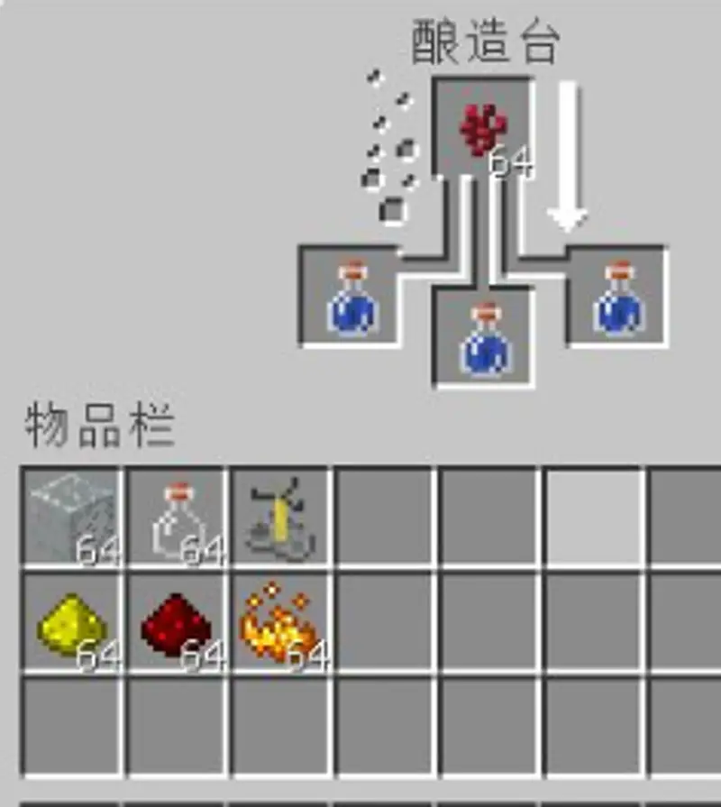 4.要制作力量药水需要先将水瓶炼制出粗制的药水,我们在酿造台中放入水瓶和地狱疣炼制粗制的药水,一个地狱疣可以炼制三瓶粗制的药水。