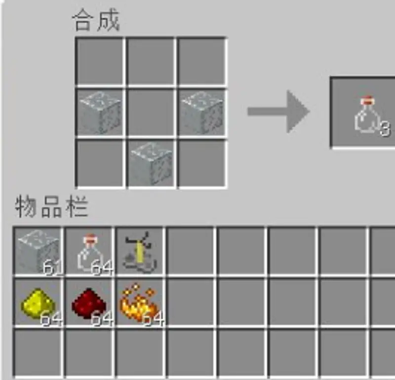 1.首先,我们需要准备的材料是:酿造台,玻璃,至少三个,地狱疣,烈焰粉,红石粉,制作持续时间延长版需要准备,萤石粉,制作力量加强版需要准备。