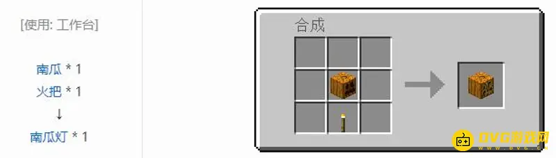 2,接着按照如图所示用一个南瓜和一个火把就可以合成南瓜灯了。