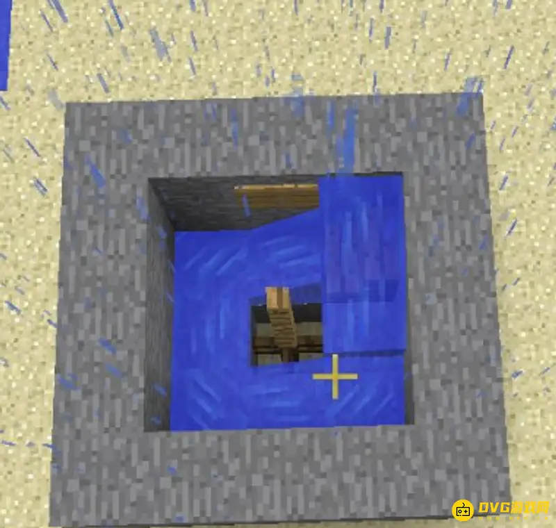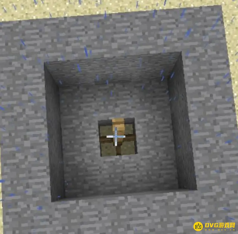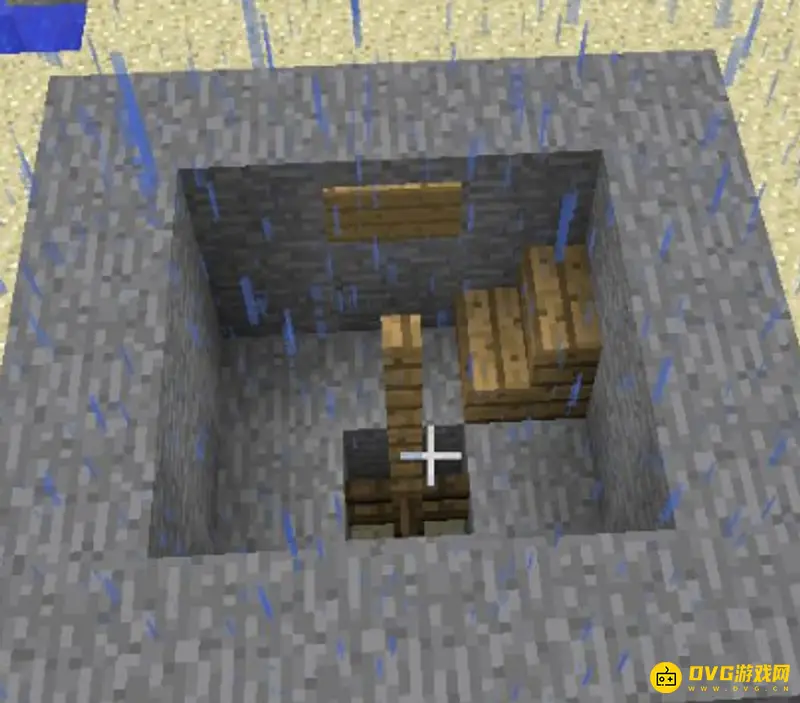 6.然后在楼梯的上面倒入一桶水,水只会在楼梯的另一侧流出。因为左侧是木牌遮挡的。这样一个简单有效的挂机池就完成了。
