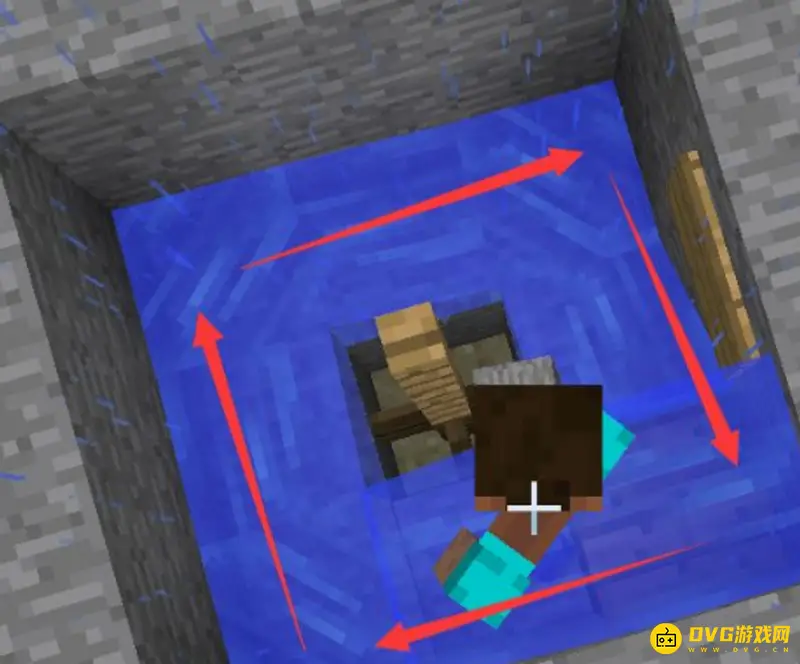 7.我们的人物只需要站在水里就可以了,水流会带着我们的人物进行流动,而流到木牌的位置因为有个楼梯,我们会被冲到楼梯上面掉下去,再次循环。这样我们就会一直围绕着中心的栅栏旋转了。