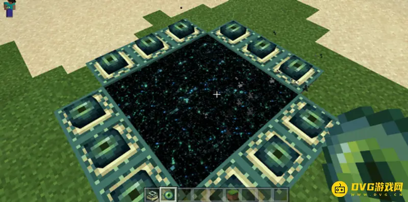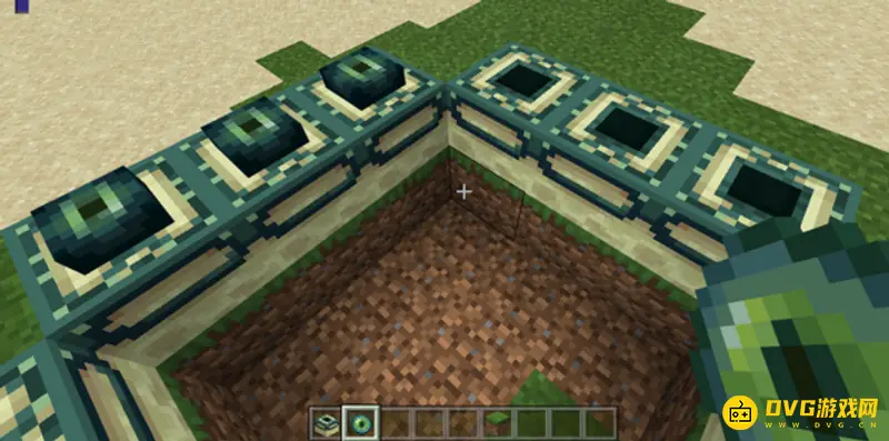 3、然后站在这个坑中,在这个坑的边沿上各摆放末地传送门,一边3个共12个,玩家必须全程站在这个3*3的坑里摆放末地传送门,否则激活不了。方块按照3x3摆放出末地传送门框架,这里要注意方块有摆放的顺序。在摆放方块的时候,有一个特定的方向,在最后摆放出来的末地传送门框架的每一个方块的正面是向内侧的。
