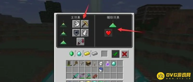 5.激活这些buff的方式是,用一个铁锭、金锭或者钻石、或者绿宝石中的一个,放到格子中,点击左边的主效果中的一个,然后点击下面的绿色勾√就可以了。
