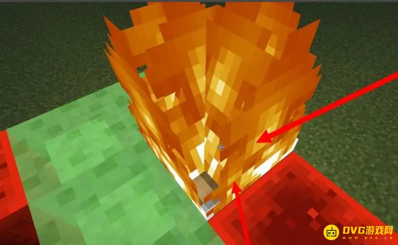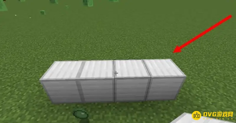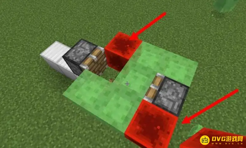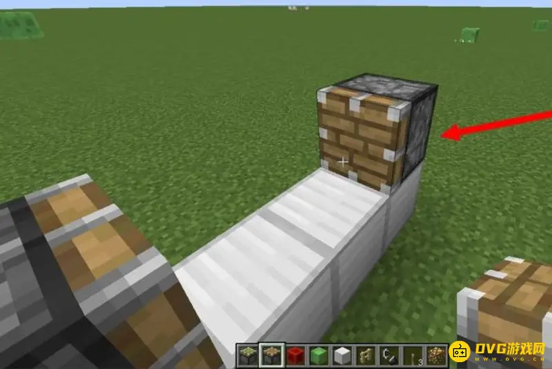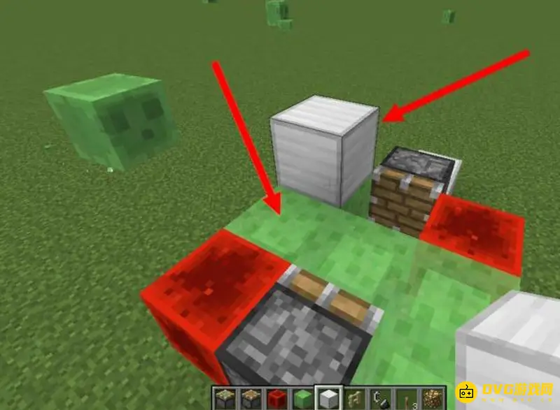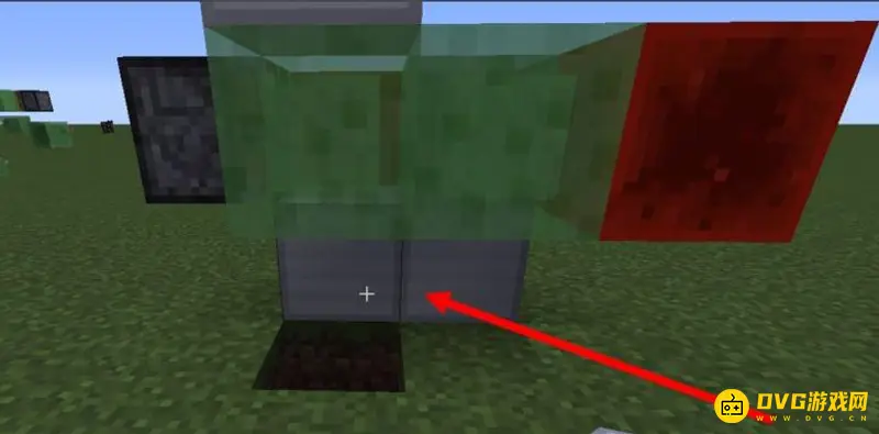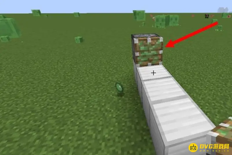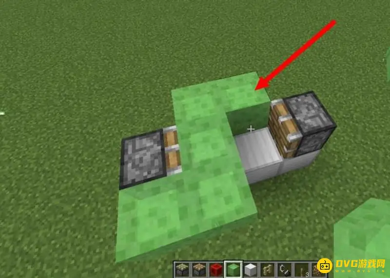 7、接着在上边靠近普通活塞的粘液块上放一个方块,这就是挡着你的,你就站在这个方块的前面,也就是图中箭头指的位置