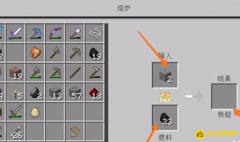 使用熔炉,在燃料处输入煤炭,输入处输入铁矿石,等待几秒后,即可获得铁锭。
