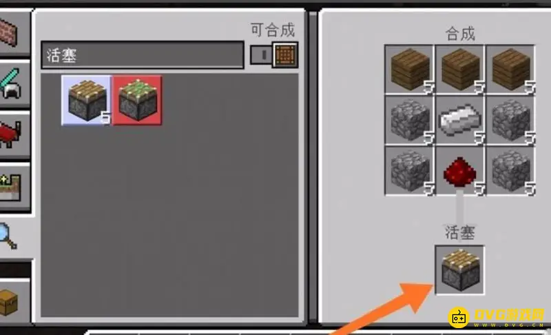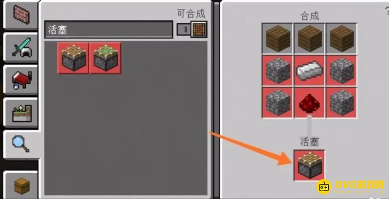 我们点击工作台,搜索活塞,找到活塞配方,发现活塞是由橡木板,圆石,铁块和红石制作而成,如下图所示;