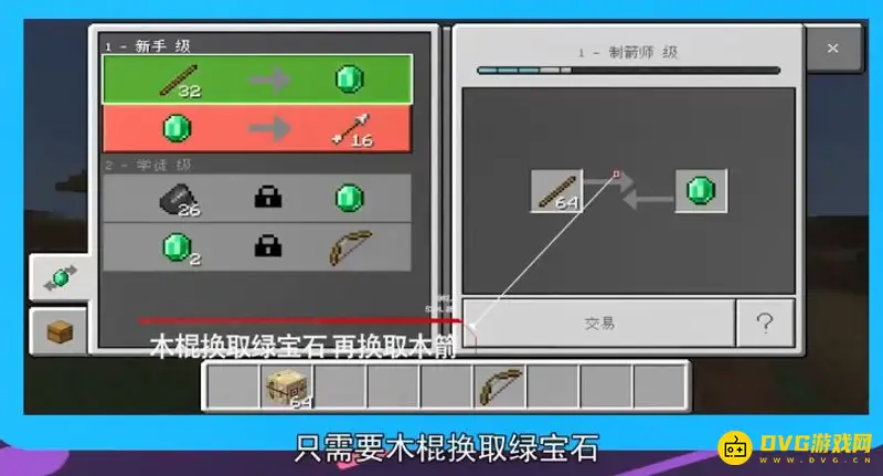 5、只需要木棍换取绿宝石,再用绿宝石换取木箭即可。