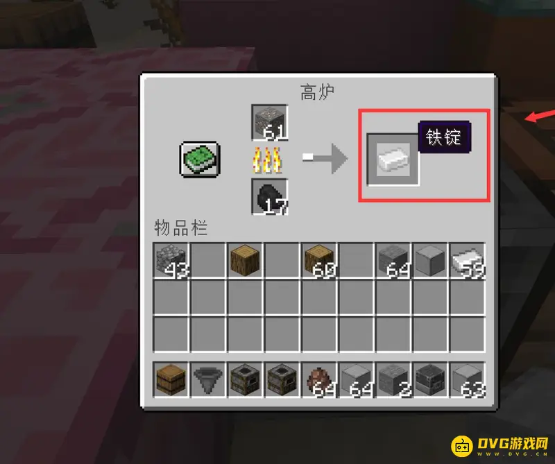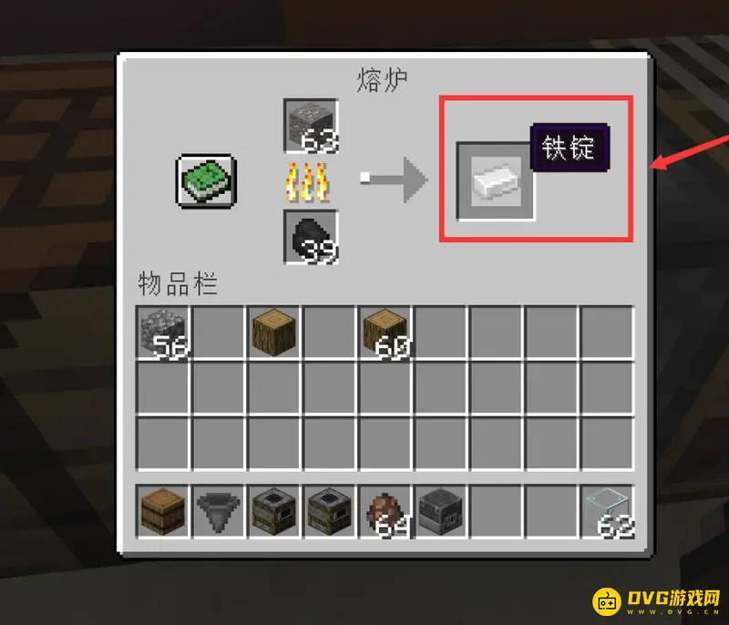 3.然后,我们需要将采集到的铁矿石放置到熔炉当中,会得到一定数量的铁锭。