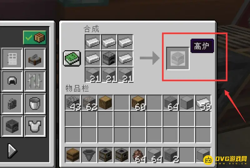 4.接着,我们可以使用平滑石头、熔炉以及铁锭进行高炉的合成。