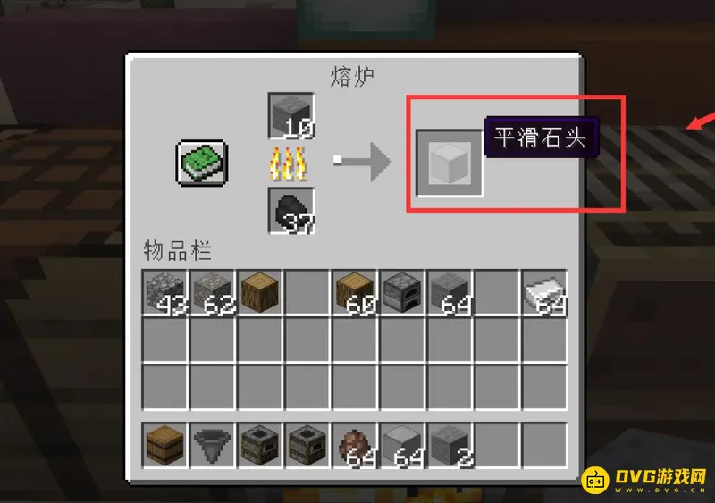 2.得到石头以后,我们需要再次将石头放置在熔炉当中,石头将会被烧制成平滑石头。