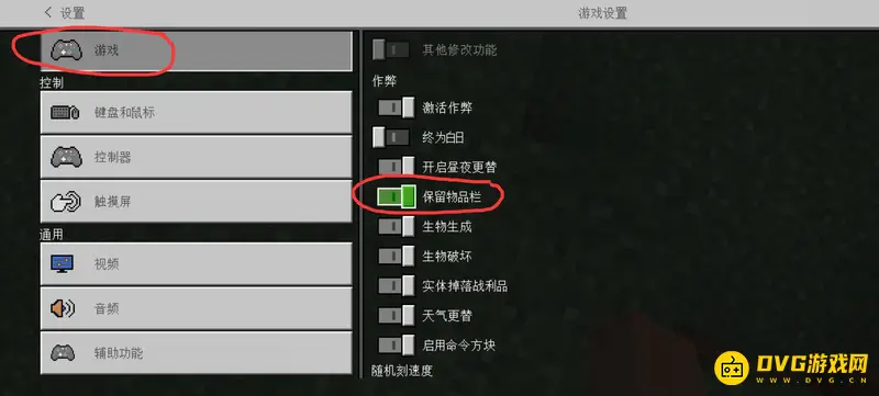 2,然后点击左侧游戏,把右侧的保留物品栏开启即可。