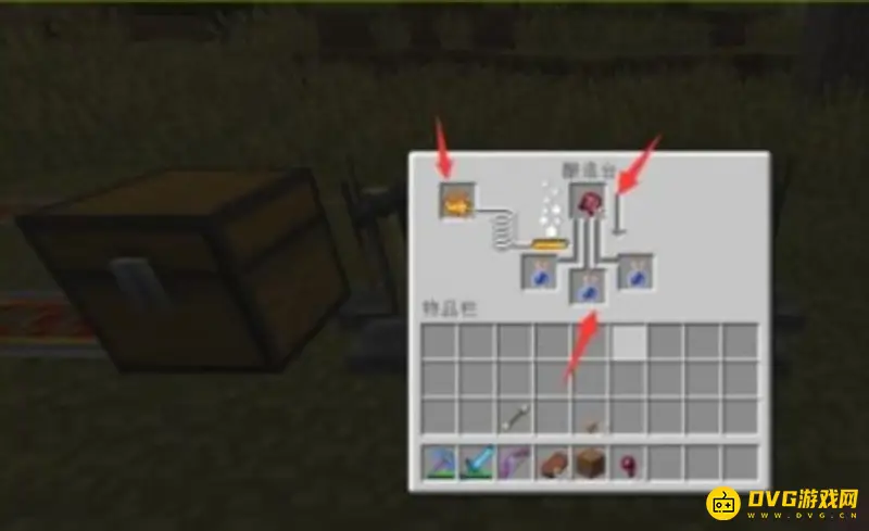 3、在酿造台中放入烈焰粉、发酵蛛眼以及3瓶水瓶。