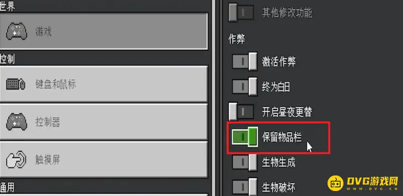 4.找到”保留物品栏“将其开启;当开启了保留物品栏之后,死亡的时候就不会掉落物品。