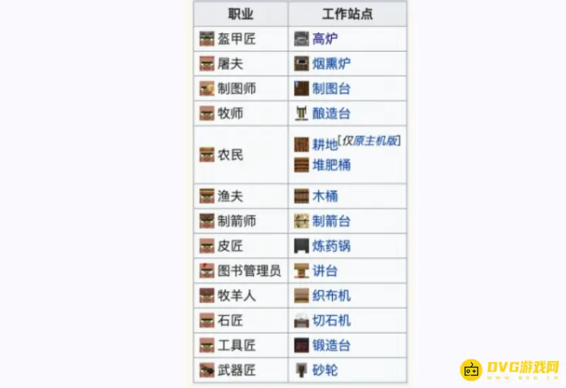 我的世界村民工作台有盔甲匠的高炉、屠夫的烟熏炉、制图师的制图台、牧师的酿造台、农民的耕地和堆肥桶、渔夫的木盒、制箭师的制箭台、皮匠的炼药锅、图书管理员的讲台、牧羊人的织布机、石匠的切石机、巨匠的锻造台和武器匠的砂轮。