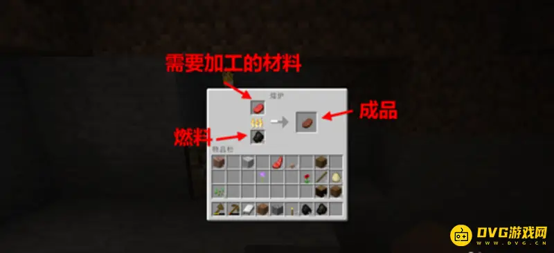 5.左侧第一格放置需要加工的物品,第二格放置燃料,右侧的格子取出成品。