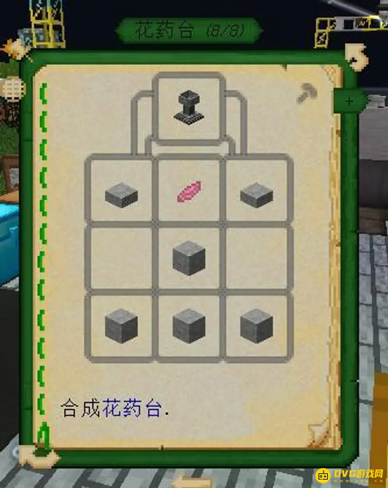 我们先在基础中找到花药台这个东西,因为这是基础中的基础,按图中在合成台上合出。花药台的功能是合成各种花,合成前必须装一桶水 ,材料放好后还需要扔进去一个小麦种子激活合成