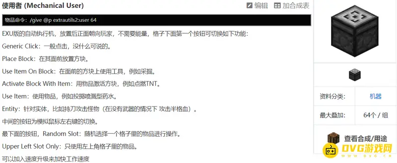 使用者是EXU版的自动执行机,放置后正面朝向玩家,不需要能量,格子下面第一个按钮可切换如下功能: