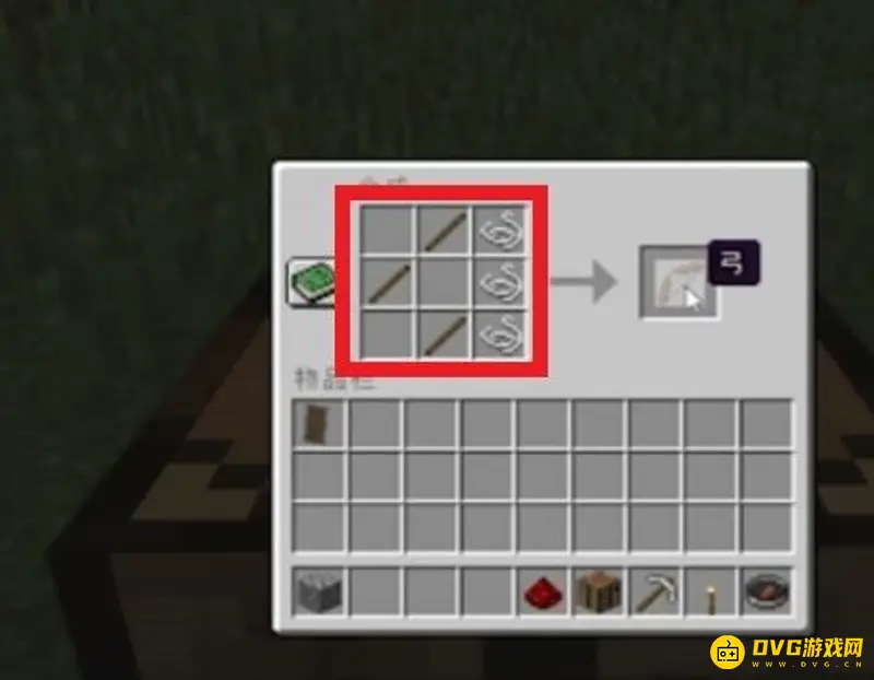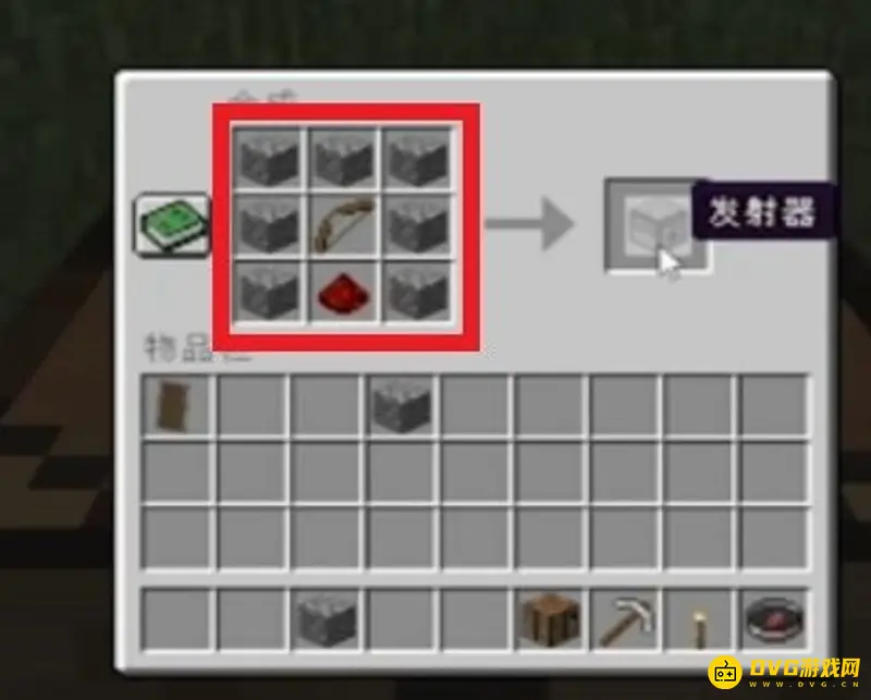 3、接着,我们需要在一些矿洞或者深处地层中找到一些红石,搜集齐全材料后,我们按照下图的这个摆放顺序摆放材料,就可以成功制造出发射器。