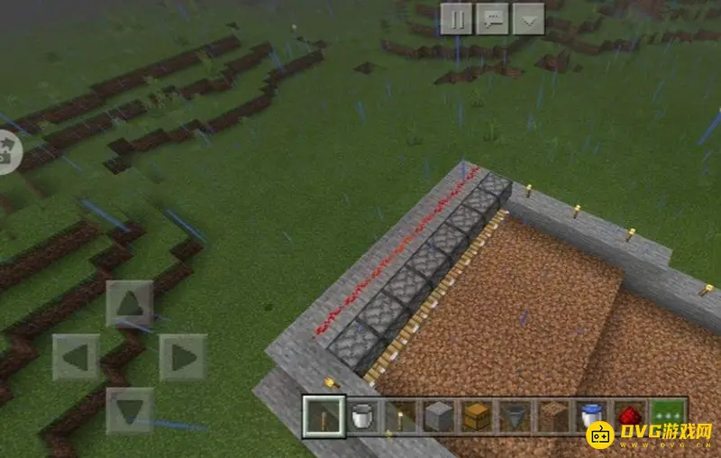 11、石头的上方放一排红石。红石连接到一个开关上面。打开开关,使活塞全部向下切断水流。
