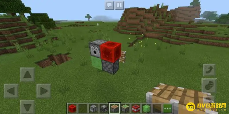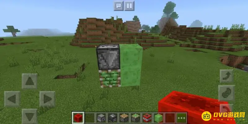 制作轰炸机的尾部,需要放置一个红石块,但是要清楚,红石块在搭建的时候是不用放置的,它只有启动的时候才会被加上去。一个向后的发射器,一个向前的普通活塞,用粘液块连接二者,尾部就完成了。