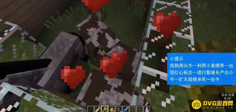 2.用小麦分别喂养两头“成年牛”,会出现“红心”标志,之后会进行繁殖。