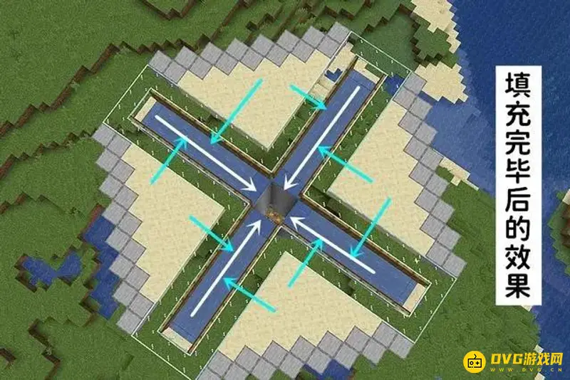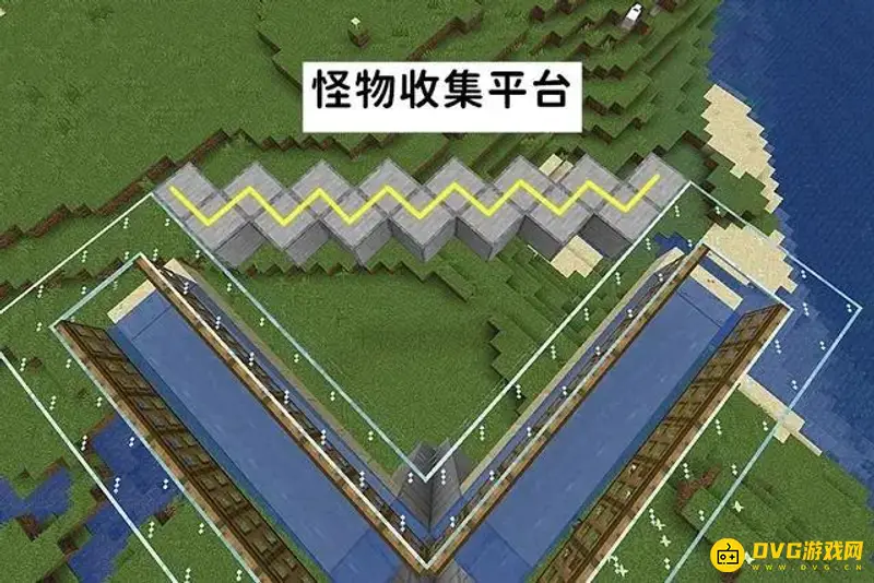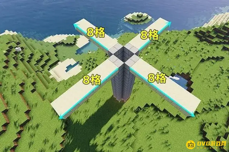 5、使用圆石按照图中所示的形状修建刷怪塔的边界,每个方向皆是如此。