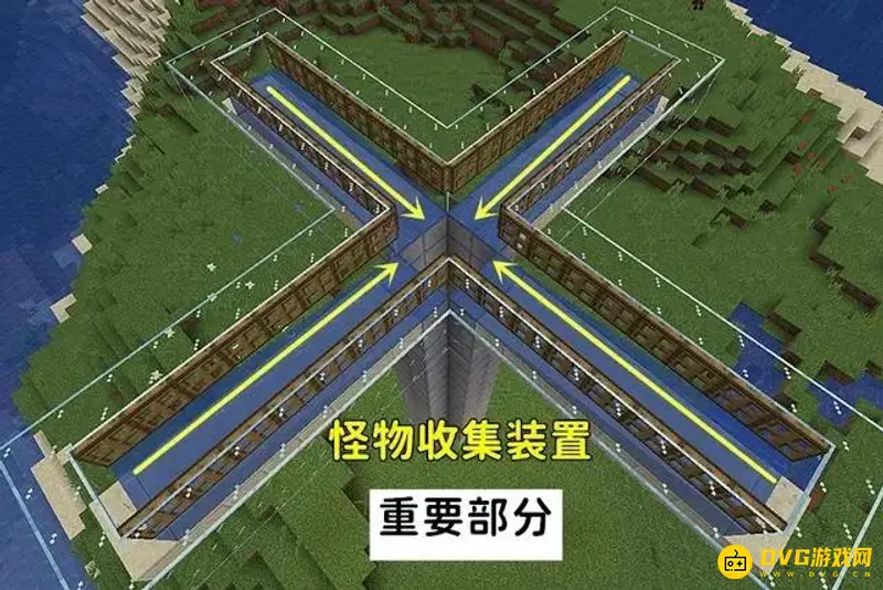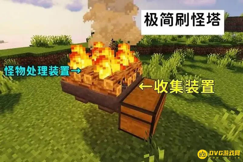 1、先放置漏斗,在漏斗上放置营火,营火对生物造成伤害的同时又不会烧毁掉落物。