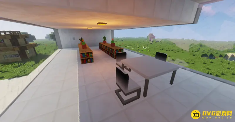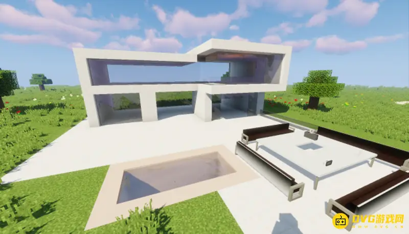 7、这里提醒大家一下,这里使用了家具mod,觉得还不错的小伙伴可以去下载一个自己试试哦。泳池的旁边放上了沙发以及一个风格比较现代的桌子,桌子上放了一个闹钟、玻璃杯和一个扩音器,这些都是家具mod当中的东西!